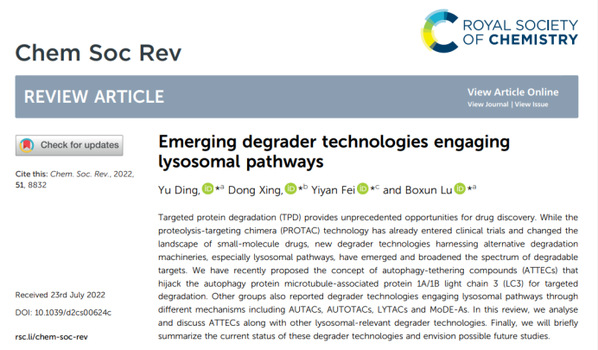 | Chemical Society Reviews封面综述!复旦大学鲁伯埙、丁澦、费义艳与华东师范大学邢栋合作发表以ATTEC等技术为代表的靶向溶酶体途径的降解新技术综述 |