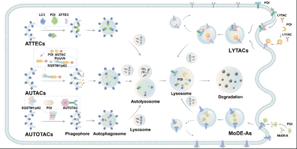 2019年,鲁伯埙、丁澦、费义艳等组成的合作团队在Nature发表了靶向自噬-溶酶体的生物大分子靶向降解技术(ATTEC,AuTophagy-TEthering Compounds),相关领域对此项研究给予了高度评价,受多本权威期刊推荐,Nature也在同期配发了专门评论,随后本论文入选了Nature评选的2019年度十大杰出科技论文。2021年,合作团队又在Cell Research以封面论文形式发表了脂滴的靶向降解技术,首次报道了非蛋白质类生物大分子的靶向降解。其后多个国内外研究团队开发和发展了基于ATTEC原理的靶向降解分子,或其他靶向溶酶体的降解新技术。本综述论文系统总结并深入分析了该领域代表性技术,并为领域进一步的发展提供了洞见,以期相关技术在近期能有更为蓬勃的发展,通过创新性的技术手段为生物医学发展、原创药物研发和提升人民群众健康水平助力。