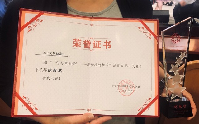 5月23日下午,上海市侨联组织的高校和科研院所侨联“侨与中国梦——我和我的祖国”诵读大赛在东华大学举行。我校 “七十光华朗诵队”参加了此次诵读大赛,并获得优胜奖。