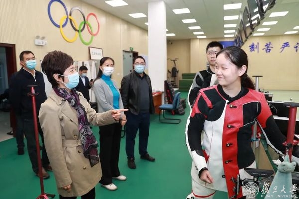 武装部部长张阳勇从射击队发展历史、突出成绩、培养方案和未来目标等方面汇报了工作。复旦大学射击队创立于1980年,1987年被原国家教委首批认定为可招收射击高水平运动员的“高水平运动队”。现有队员19人,其中研究生4人,本科生15人,项目主要集中在男女步手枪、女子飞碟。到目前为止,复旦大学射击队共夺得世界冠军5个,世界亚军6个、世界季军4个,亚洲冠军2个,全国冠军117个,上海市冠军190个,成长为全国高校优秀运动队,成为高校高水平运动队建设和体教融合发展的典型案例。