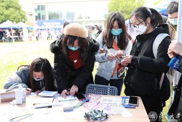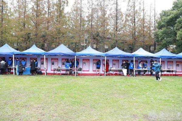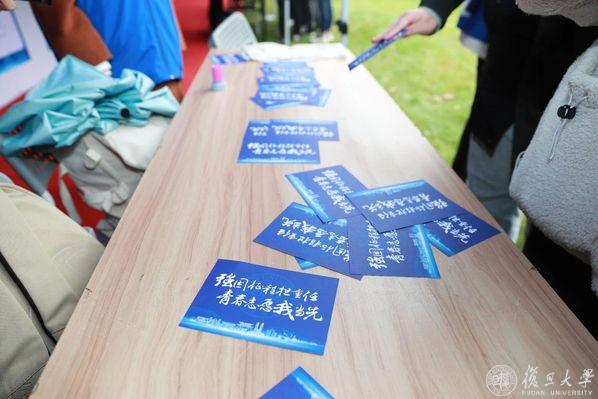 写手信、叠千纸鹤、竞赛答题……又一年光华楼东辅楼旁的草地上,一个个半包围支起的蓝色小棚子,穿梭其间, “蓝马甲”们正在同学们手中的卡片盖上“友爱互助”、“服务进取”、“牺牲奉献”等纪念戳,虽是寒风天,但活动现场热烈氛围依旧高涨。