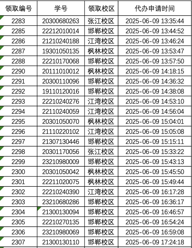 张江校区:6月13日—6月26日8:00-11:30,13:30—17:00