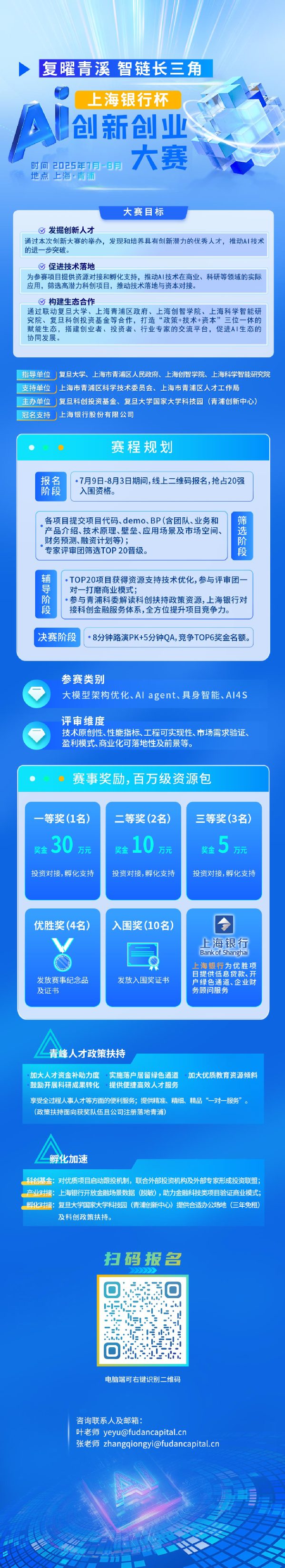 “AI赋能未来:创新与应用的无限可能”复曜青溪 智链长三角——上海银行杯AI创新创业大赛正式启动!这里不仅是技术的竞技场,更是梦想的孵化器,聚焦AI技术在技术创新、产业应用中的跨界融合,推动AI模型从实验室走向真实场景,构建AI生态。报名已开启!赛事干货全都有