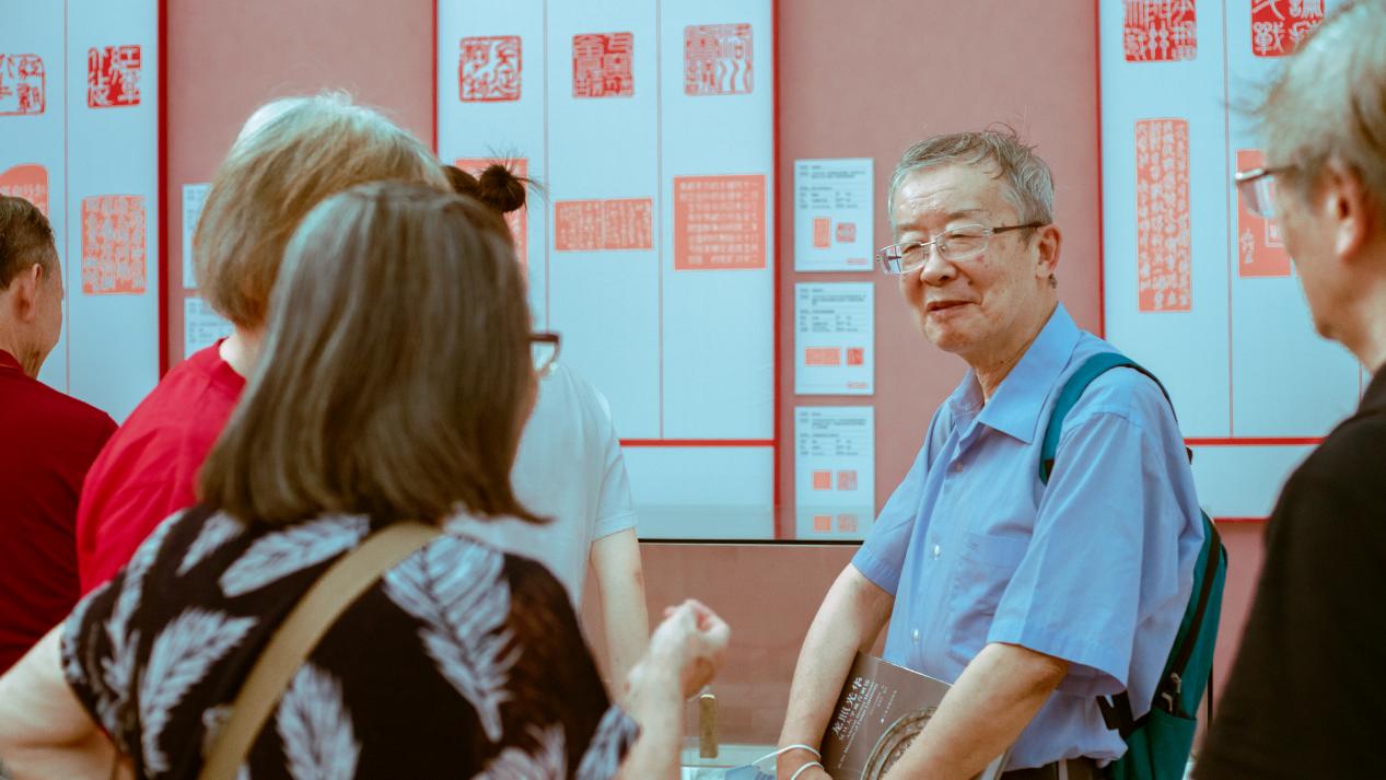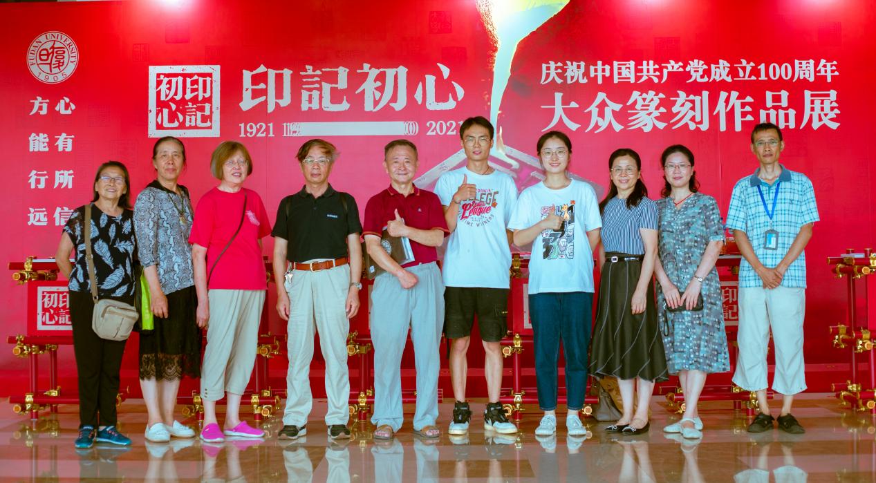随后一行人又来到光华楼二楼志和堂参观“印记初心:庆祝中国共产党成立100周年大众篆刻作品展”。在大众印社两位志愿者社员的讲解下,退休盟员们沉浸于金石艺术的世界,感受汉语文字和造型的魅力,体会“心在印外,形存石中,字为意生,境由心造,方寸之间,气象万千”的意境。此次印章展还尝试选用碳素玻璃纤维、3D打印等材料,将中国的传统艺术与现代科技相结合,将百年党史重大事件描绘于一个个方寸之间,退休盟员们籍此重温党史,也更加深刻理解了“不忘初心 牢记使命”的重大意义。