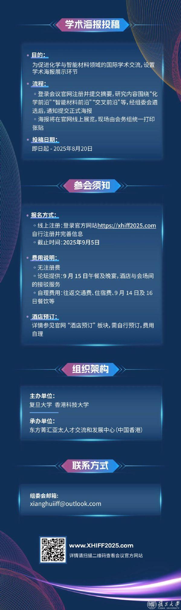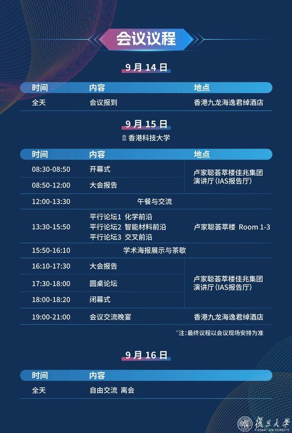 为应对全球科技变革挑战,推动前沿科学突破,复旦大学与香港科技大学将于2025年9月14日至16日在香港科技大学联合举办首届相辉创新前沿国际论坛。本次论坛以化学与智能材料为主题,旨在打造具有全球影响力的顶尖学术交流平台。