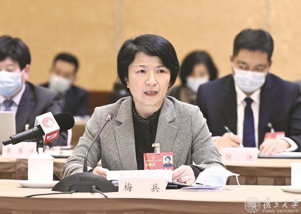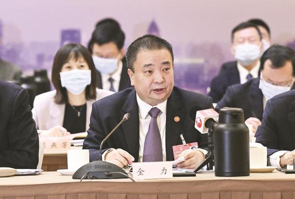 全国人大代表金力和梅兵在上海代表团全团审议现场发言。 均张驰摄