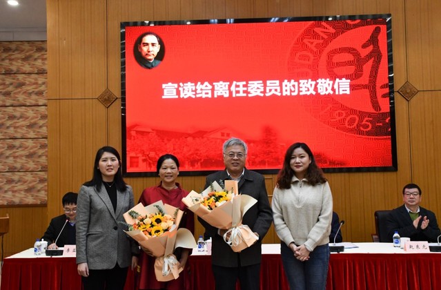 薛磊代表新一届委员会向臧志军、施胜今、华逢春等离任委员宣读致敬信并献花,感谢他们多年来为委员会发展做出的贡献。