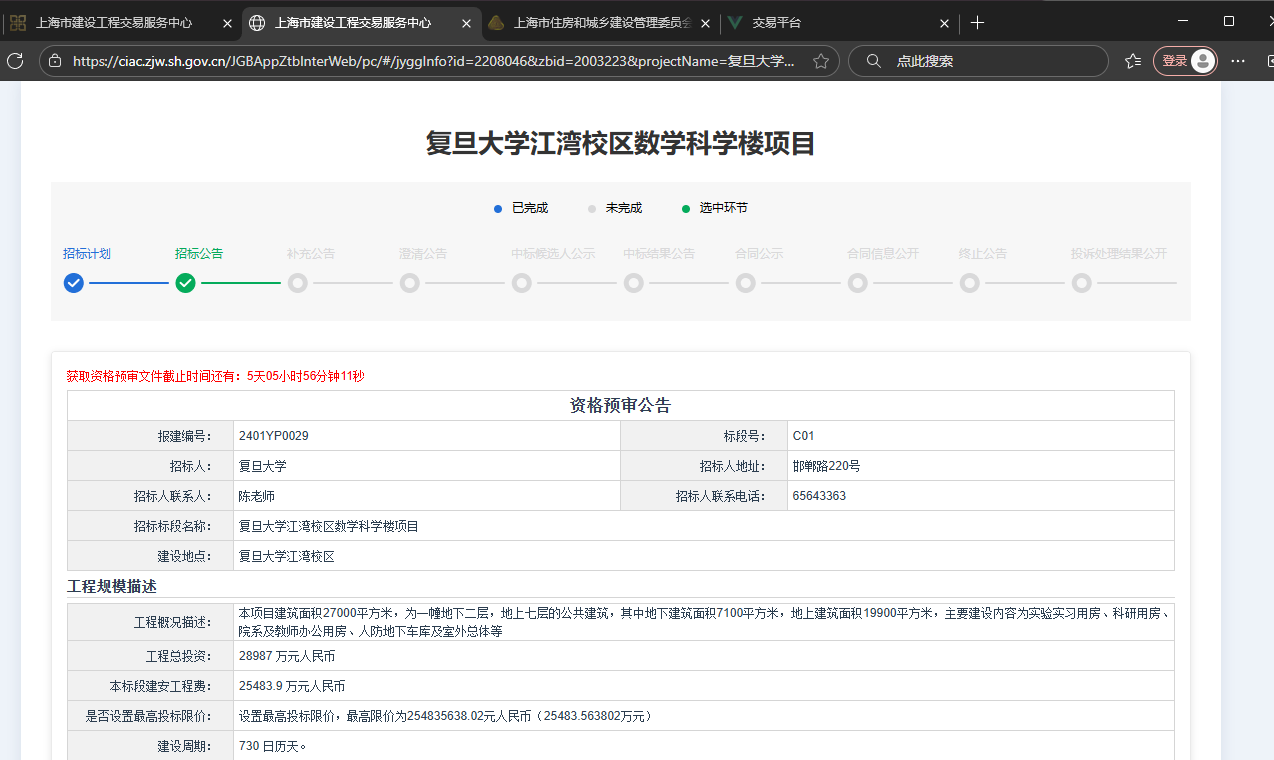 复旦大学江湾校区数学科学楼项目施工招标资格预审公告(转发)