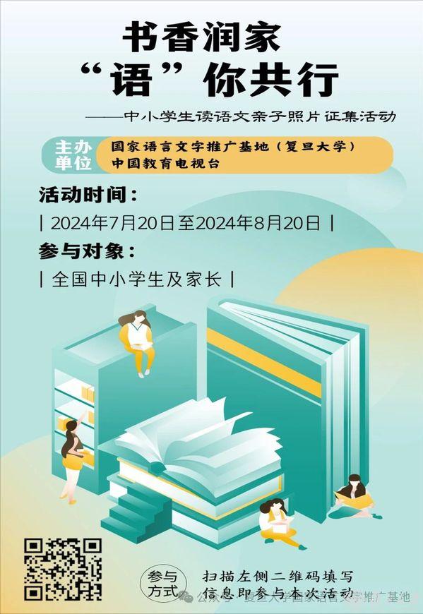即日起,国家语言文字推广基地(复旦大学)与中国教育电视台发起“书香润家,‘语’你共行”照片征集活动。请您以照片形式,晒出家长与孩子温情共读的瞬间,可用微信扫一扫海报二维码参加活动,同时还可在新浪微博中@推广普通话官方微博 ,参与 #书香润家“语”你共行# 相关话题。