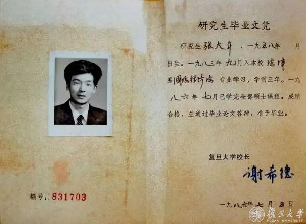 首届国际经济法专业硕士研究生张大年的毕业文凭