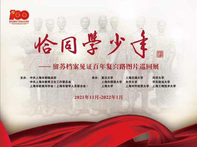 据悉,为庆祝中国共产党成立100周年、中国留学生赴苏俄留学100周年,让师生更好了解留学归国人员报效祖国的光辉历史,做好“四史”学习教育、领会六中全会精神,由市委统战部、市教卫工作党委、市欧美同学会联合主办,上海市9所高校联合承办的“恰同学少年——留苏档案见证百年复兴路图片巡回展” 于12月8日至21日在复旦大学邯郸校区光华楼二楼志和堂展出。