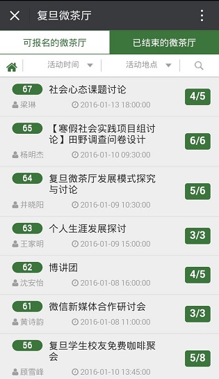 如有意愿参与活动,可点击图5中的 “广场”,将会跳出活动列表(见图6)。点击左上角“可报名的微茶厅”,点击你感兴趣的项目并报名,即可参加活动。每项右侧绿色的方块,代表已报名人数/活动限制人数。