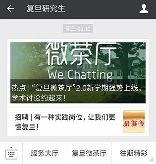 为方便全校研究生了解和使用,“复旦微茶厅”在我校研究生普遍关注的微信公众号“复旦研究生”以及校研究生会官微“复小研”设立了登录界面。