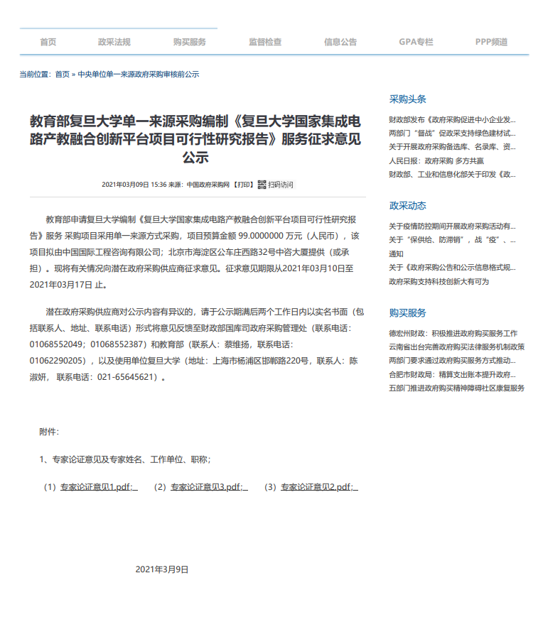 教育部复旦大学单一来源采购编制《复旦大学国家集成电路产教融合创新平台项目可行性研究报告》服务征求意见公示