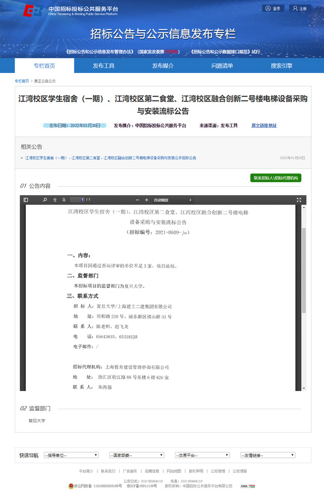 江湾校区学生宿舍(一期)、江湾校区第二食堂、江湾校区融合创新二号楼电梯设备采购与安装流标公告(转发)