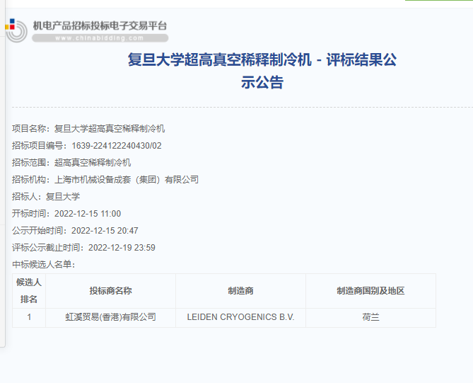 复旦大学超高真空稀释制冷机评标结果公示