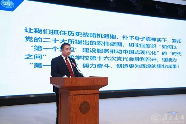 金力向大会作《复旦大学年度工作报告》。2022年,学校深入学习宣传贯彻党的二十大精神,坚持用习近平新时代中国特色社会主义思想铸魂育人;加强战略谋划,加快新一轮“双一流”建设;落实立德树人根本任务,完善人才自主培养体系;加强有组织科研,创新能级显著提升;落实“大人才”战略,构建新时代人才工作新格局;主动服务国家战略,积极融入新发展格局;坚持以师生为中心,提升学校资源保障服务水平。