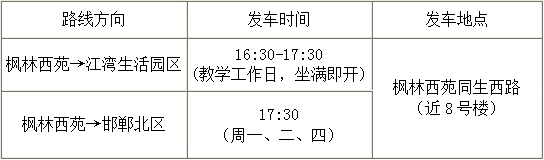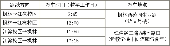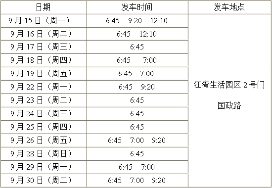 2.为保证专车运行更为合理,9月15日-30日为试运行期,现行时刻根据排课时间而定,每日不同。之后将根据实际开课情况作调整。