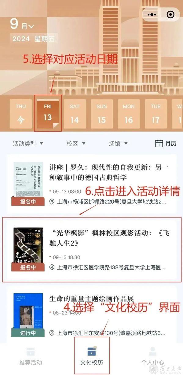 1.进入“文化校历”主界面选择对应的活动日期即可看到当日活动列表;