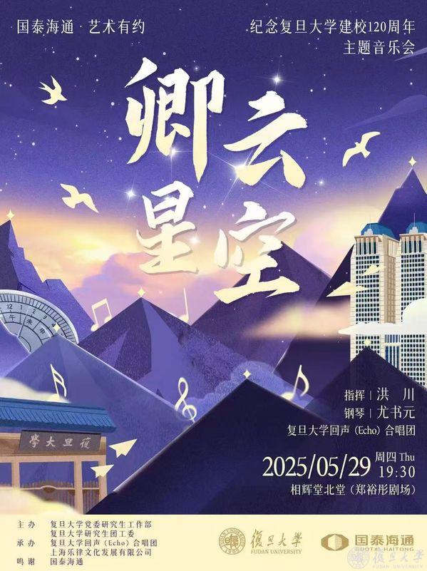 很快,这一呼吁得到回应。回声(Echo)合唱团驻团指挥、回声少年合唱团常任指挥、复旦大学经济学院2010级校友施嘉俊听闻此言,立刻投入到《共同的模样》谱曲创作中。今夜,在“卿云星空”纪念复旦大学建校120周年主题音乐会上,首个完成谱曲的参赛作品由回声(Echo)合唱团在相辉堂北堂唱响。