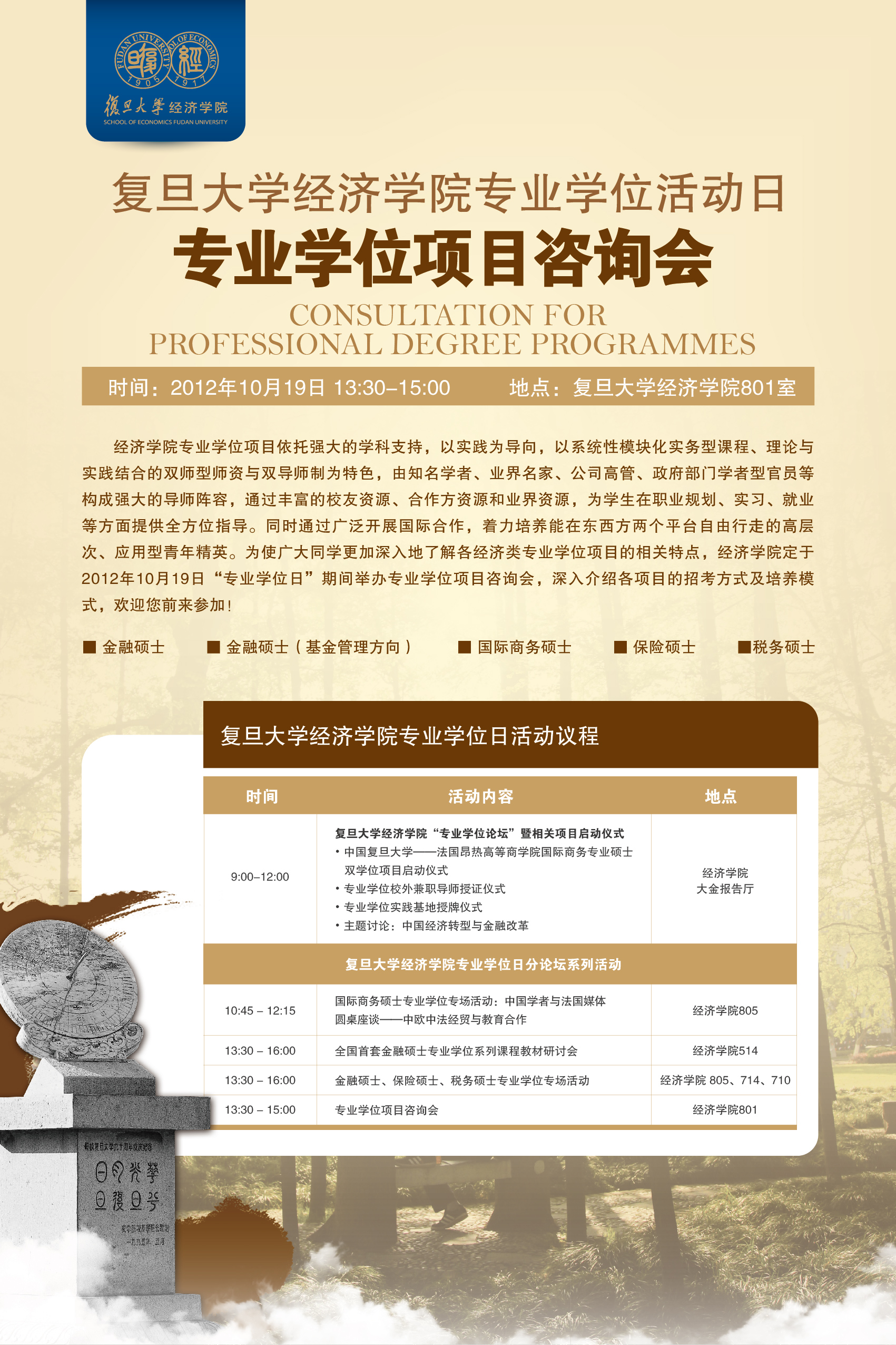 复旦大学经济学院专业学位活动日 专业学位项目咨询会 Consultation for Professional Degree Programmes 时间:2012年10月19日 13:30-15:00 地点:复旦大学经济学院201室 经济学院专业学位项目依托强大的学科支持,以实践为导向,以系统性模块化实务型课程、理论与实践结合的双师型师资与双导师制为特色,由知名学者、业界名家、公司高管、政府部门学者型官员等构成强大的导师阵容,通过丰富的校友资源、合作方资源和业界资源,为学生在职业规划、实习、就业等方面提供全方位指导。同时通过广泛开展国际合作,着力培养能在东西方两个平台自由行走的高层次、应用型青年精英。为使广大同学更加深入地了解各经济类专业学位项目的相关特点,经济学院定于2012年10月19日“专业学位日”期间举办专业学位项目咨询会,深入介绍各项目的招考方式及培养模式,欢迎您前来参加! ·金融硕士 ·金融硕士(基金管理方向) ·国际商务硕士 ·保险硕士 ·税务硕士 复旦大学经济学院专业学位日活动议程 (2012年10月19日)