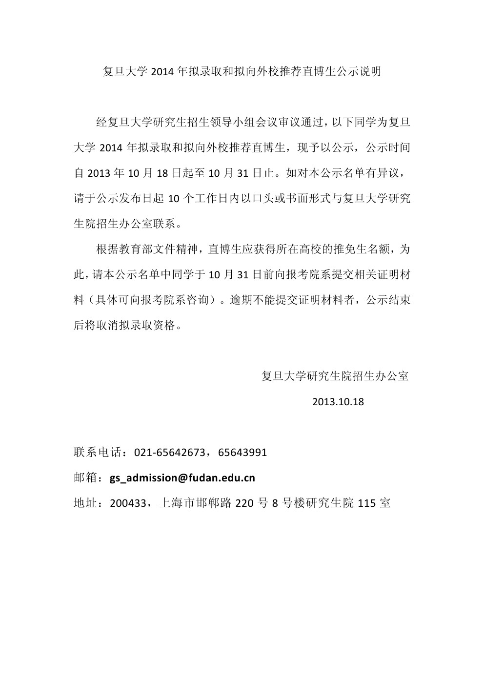 复旦大学2014年度拟招收推荐免试研究生和向外推荐免试研究生公示名单(直博生)