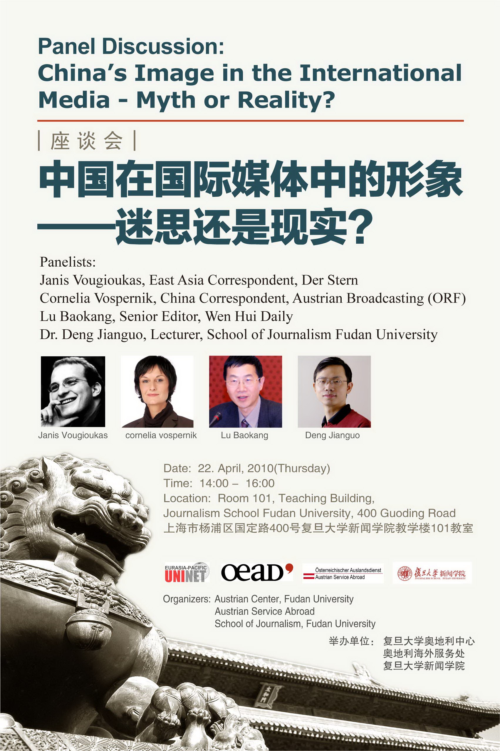 Panel Discussion: China´s Image in the International Media - Myth or Reality? 座谈会: 中国在国际媒体中的形象 – 迷思还是现实? Date: 22. April 2010 Time: 14:00 - 16:00 Location: Room 101, Teaching Building, Journalism School Fudan University, 400 Guoding Road 上海市杨浦区国定路400号复旦大学新闻学院教学楼101教室 Panelists: Janis Vougioukas, East Asia Correspondent, Der Stern Cornelia Vospernik, China Correspondent, Austrian Broadcasting (ORF) Lu Baokang, Senior Editor, Wen Hui Daily Dr. Deng Jianguo, Lecturer, School of Journalism Fudan University Organizers: Austrian Center, Fudan University Austrian Service Abroad School of Journalism, Fudan University 举办单位: 复旦大学奥地利中心 奥地利海外服务处 复旦大学新闻学院 海报另附。 欢迎参加! 外事处 2010-04-20 海报 China's Image.jpg |