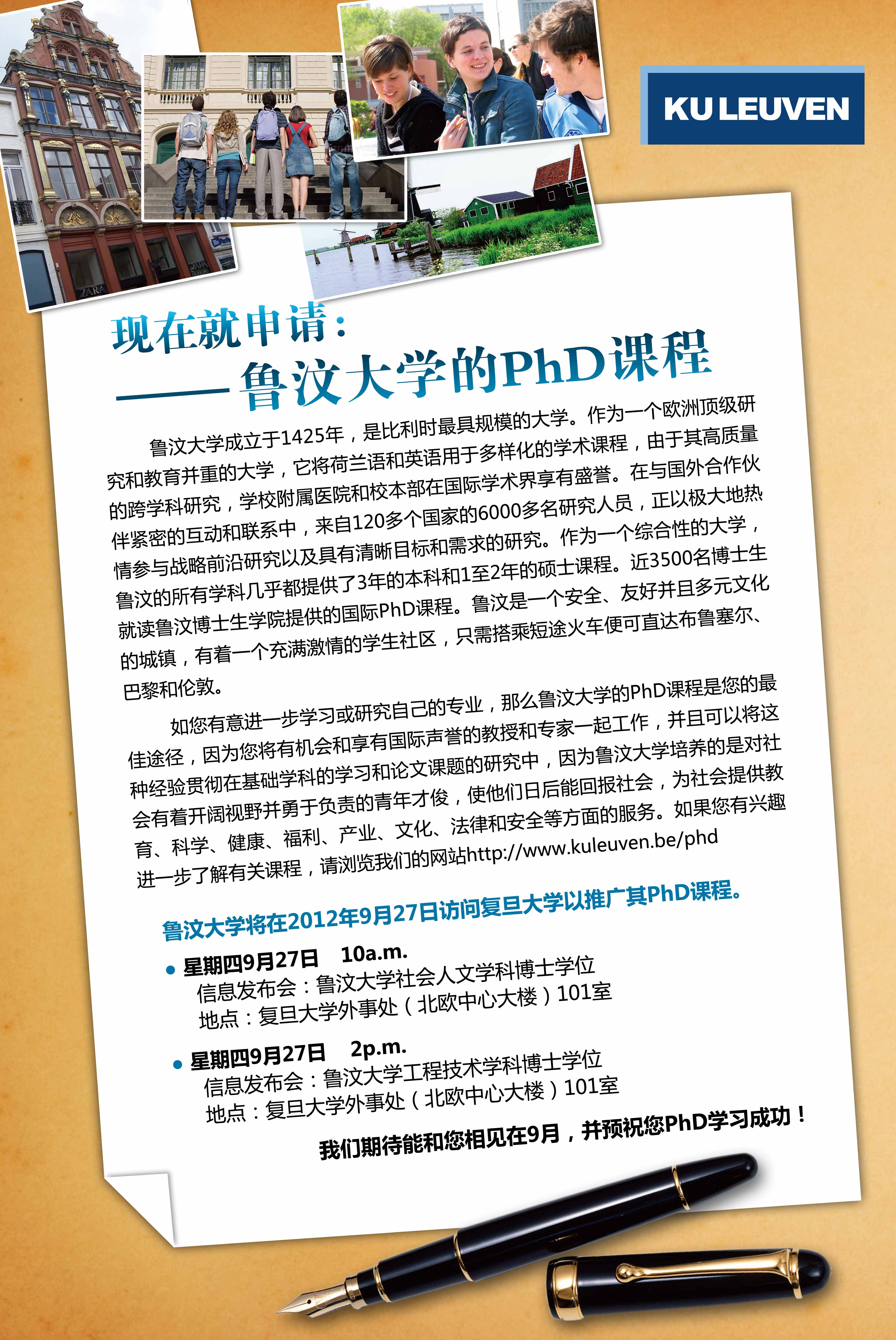 九月宣讲会之一: 2012/9/27 比利时鲁汶大学博士项目宣讲会(提供丰厚奖学金),鲁汶大学各学科教授将亲临复旦宣讲~ -10am人文社科 - 2pm理工科 地点:外事处(北欧中心大楼)101室
