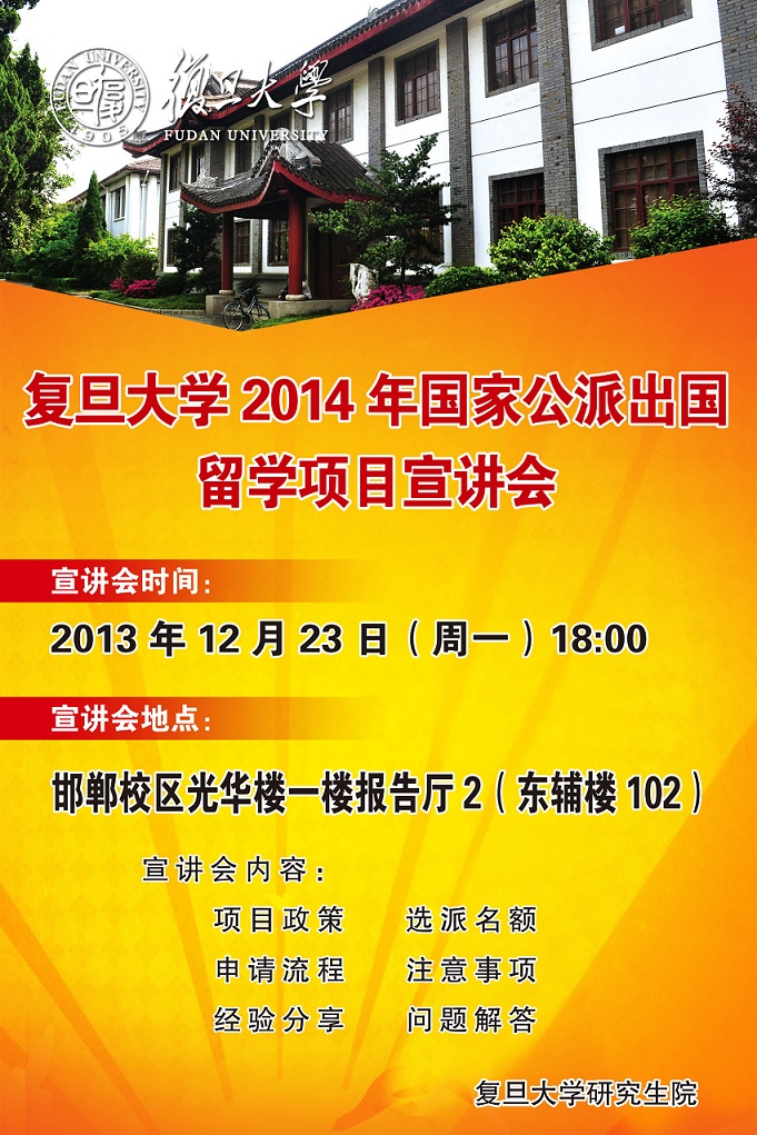 复旦大学2014年国家公派出国留学项目已经启动,为方便各位同学了解项目的要求和申报办法,研究生院将于12月23日举行宣讲会,讲解2014年国家公派研究生项目的项目政策、选派名额、申请流程、资助内容、注意事项,并有优秀公派出国留学联合培养博士生分享经验,最后是提问环节。请感兴趣的硕士/博士在读研究生、2014年本科/硕士应届毕业生和各院系相关工作的负责老师相互传达宣讲会信息,积极参加宣讲会,做好申报准备。 宣讲会时间:2013年12月23日(周一)18:00 宣讲会地点:邯郸校区光华楼一楼报告厅2(东辅楼102) 通知原地址:http://www.gs.fudan.edu.cn/s/20/t/24/f5/15/info62741.htm