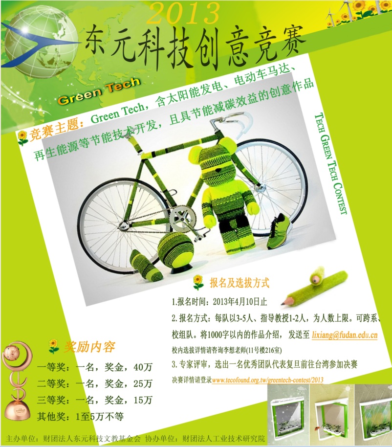 2013年东元科技创意竞赛校内报名由我校环境科学与工程系具体负责,报名方法详见海报:
