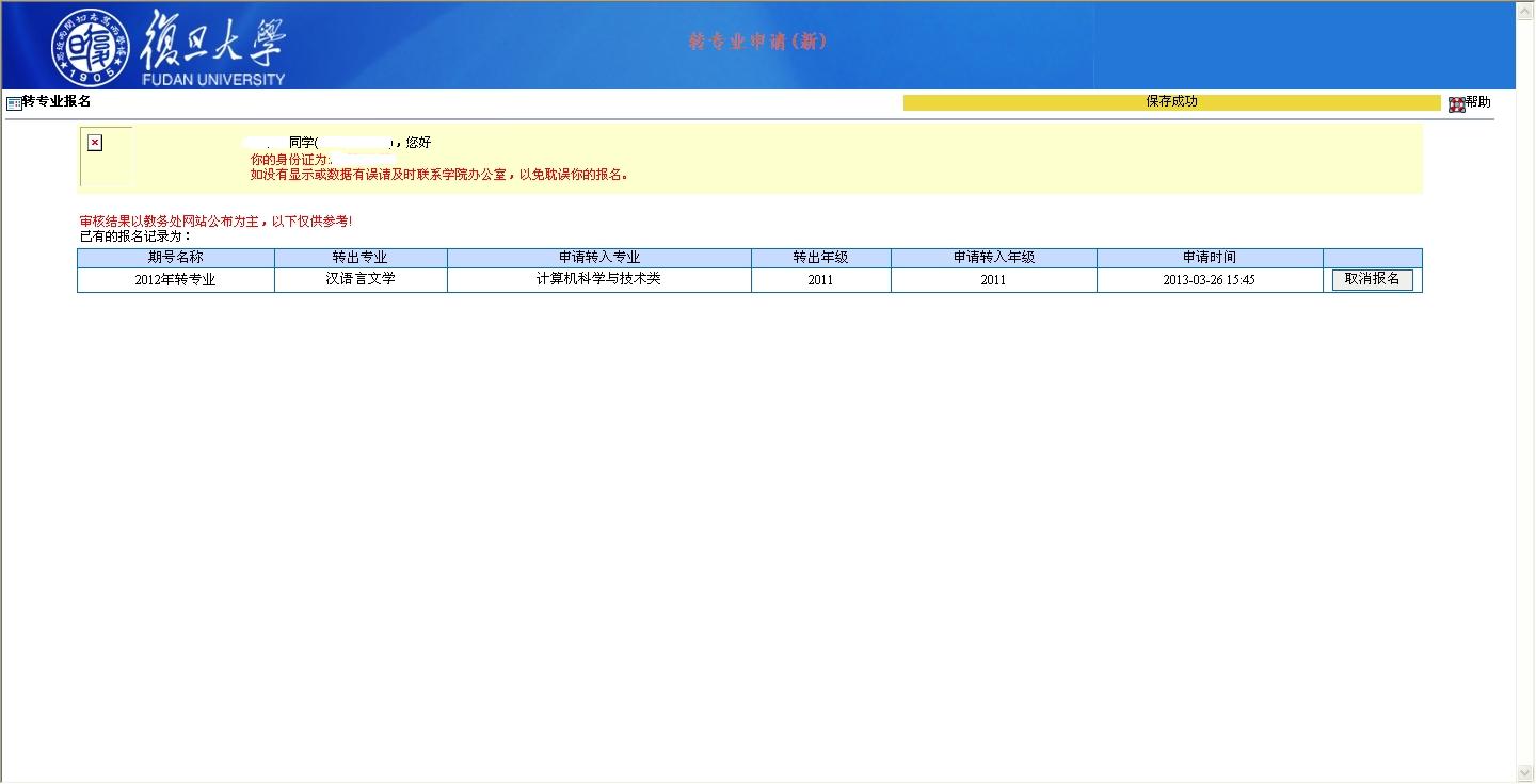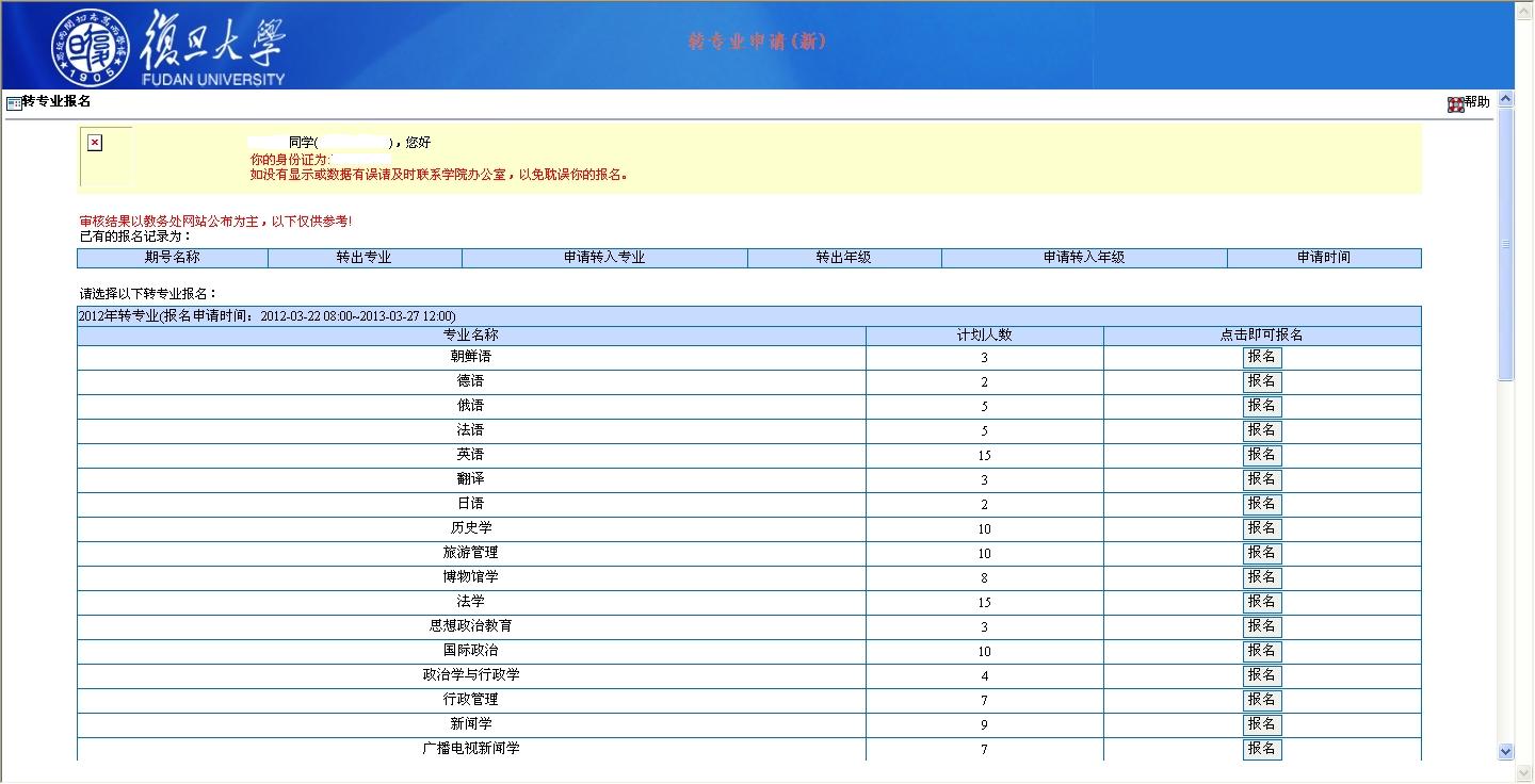 5、学生填报转专业志愿前,应仔细了解咨询相应院系对于申请者前期已修课程及成绩等方面的要求,转专业报名一旦截止,所有报名学生均将被视为在2013年春季学期参加过转专业申请。