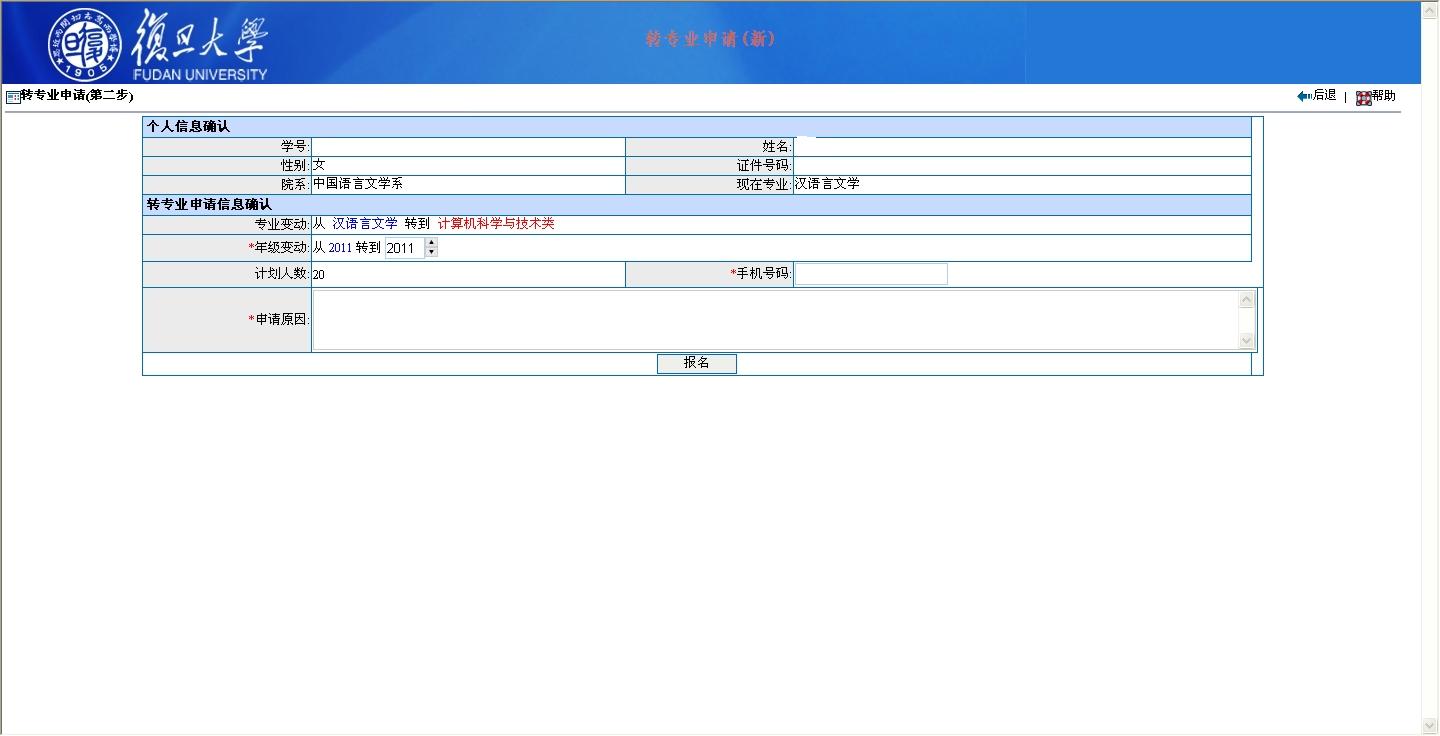 2、4月3日--7日上午11:00,学生登录URP教务系统申请转专业(报名前开通),在URP教务系统填写“复旦大学学生转专业申请”,逾期一律不再接受学生转专业申请。