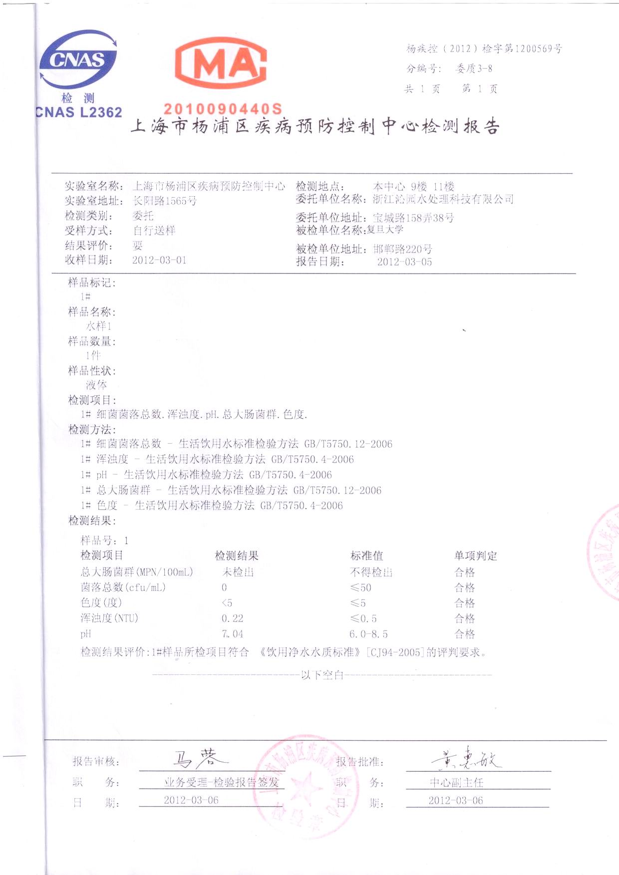 根据相关合同约定,浙江沁园水处理科技有限公司于2012年3月完成了教学楼直饮水平台上半年例行水样抽检工作(此次水样抽检地为邯郸校区第三教学楼二层半处直饮水平台),杨浦区疾病预防控制中心出具的检测报告交总务处物业管理办公室备案。