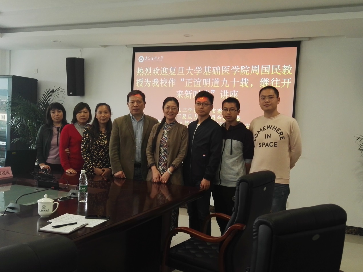 座谈会后,经由九三学社遵义医科大学委员会组织,九三学社复旦大学委员会副主委、枫林分委会主委周国民教授遵义医科大学做了“正谊明道九十载,继往开来新时代”的主题讲座,深受前来听讲的九三学社遵义社员的好评。