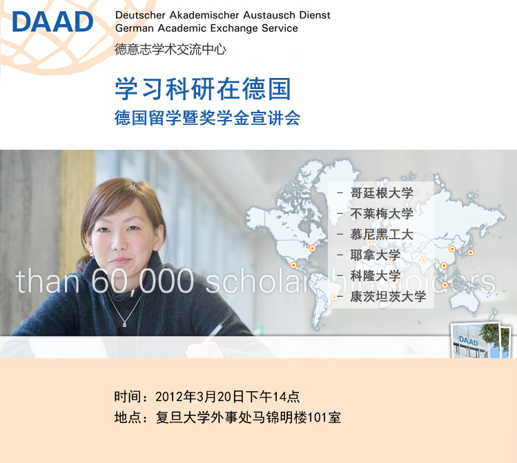 时间:2012年3月20日14:00 地点:外事处101室 届时,DAAD的留学顾问以及德国多所名校校方代表将为广大师生介绍留学德国以及奖学金申请的相关信息,现场解答大家的问题。 想要留学德国的同学们千万不要错过这个和德国留学专家面对面的机会哦!