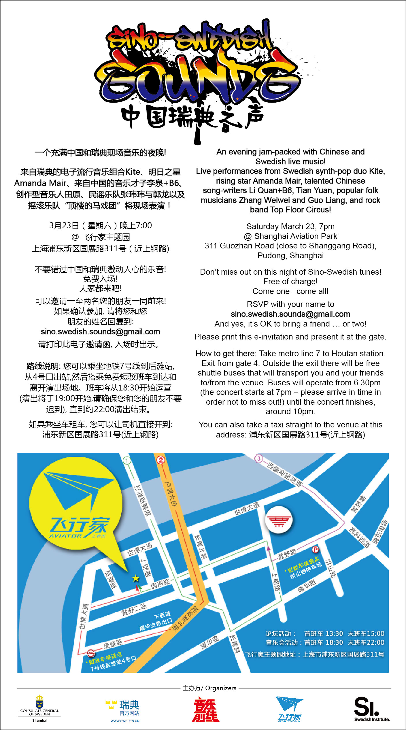 “中国-瑞典之声”活动将于3月23日在上海飞行家主题园举行,内容包括一场业界研讨会和一场由中国和瑞典流行歌手共同献演的免费音乐会。研讨会将聚集国际和国内音乐界专业人士和艺人,就中国和瑞典目前的流行音乐/音乐录影带的发展和潮流进行讨论,从而为两国在音乐领域的更多合作创造机会。音乐会则邀请到来自瑞典的电子流行音乐组合Kite、明日之星Amanda Mair、来自中国的音乐才子李泉+B6、创作型音乐人田原、民谣乐队张玮玮与郭龙以及摇滚乐队“顶楼的马戏团”为大家作现场表演。 “中国-瑞典之声”音乐会 时间:3月23日(星期六)晚上7:00 地点:上海浦东新区国展路311号(近上钢路) 飞行家主题园 欢迎感兴趣的同学将姓名、联系方式在3月20日晚8点之前发至许老师邮箱:xuyf@fudan.edu.cn。外事处将视报名情况统一安排车子接送。
