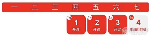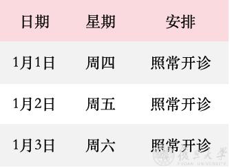1月1日(周四)门诊暂停,1月2日(周五)门诊暂停,1月3日(周六)全天门诊,开诊科室同周六,1月4日(周日)全天门诊,开诊科室同周四。