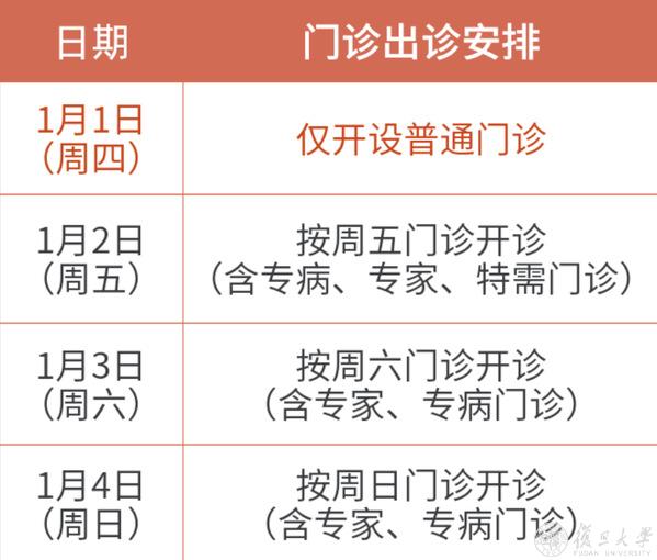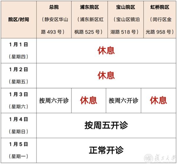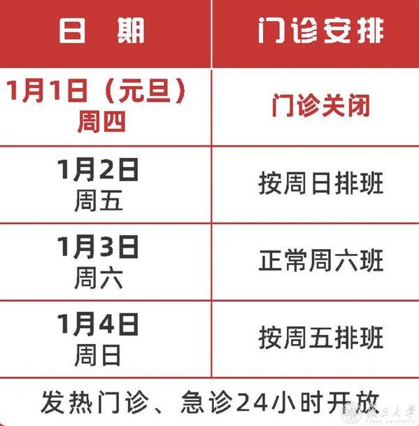 总院及闵行门诊安排一致,浦东门诊1月3日休息;普通、专病、专家、特约、特需、MDT门诊以当日出诊情况为准;急诊、发热门诊24小时开放;互联网门诊以当日排班为准;节日期间部分门诊听诊,请您提前预约;1月1日~1月4日互联网医院暂停药品自提和物流配送,1月5日起恢复自提与配送。