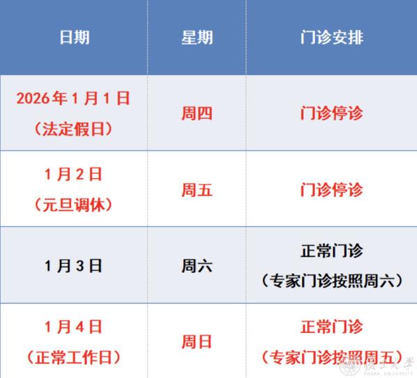 2026年1月1日(周四)至3日(周六)放假,共3天,无门诊,1月4日(周日)上班,排周四班(互联网医院与线下门诊安排同步)。