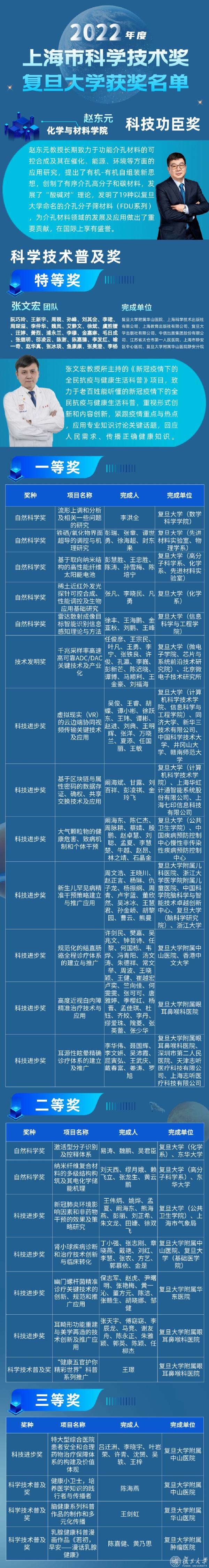 我校化学与材料学院教授、中国科学院院士赵东元荣获上海市科技功臣奖,该奖项被誉为上海科技工作者的最高奖励。附属华山医院感染科主任、国家传染病医学中心主任张文宏领衔完成的项目“新冠疫情下的全民抗疫与健康生活科普”荣获上海市科学技术普及奖特等奖。