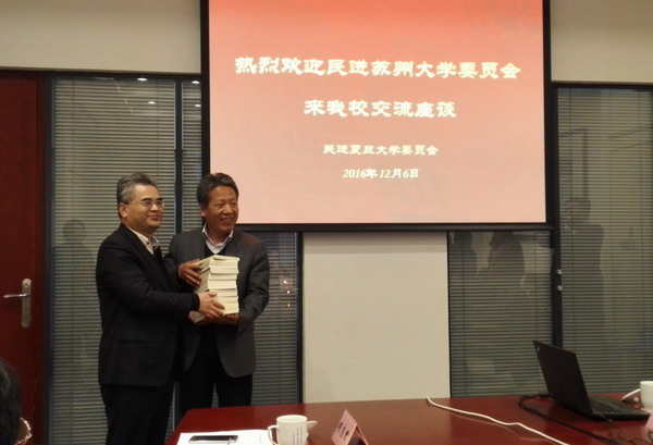 座谈会结束前,钱振明主委还代表民进苏州大学委员会向民进复旦大学委员会赠送一套苏州文化丛书。