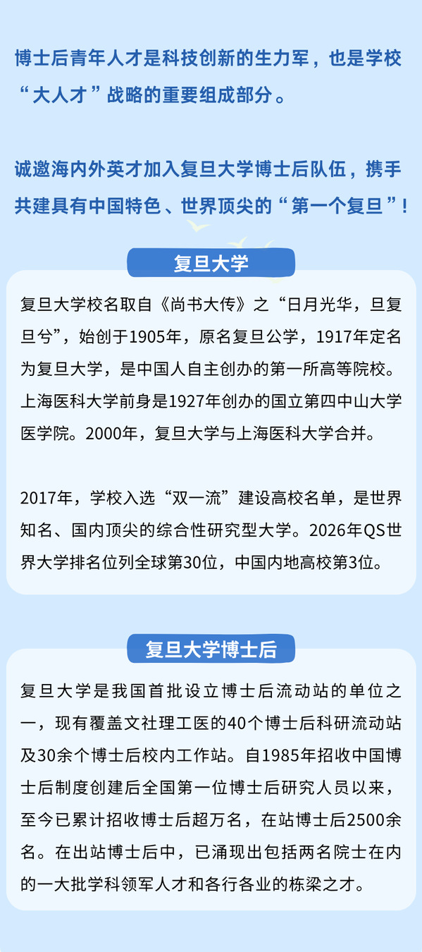 揽才全球!复旦大学2026年全职博士后招聘启动