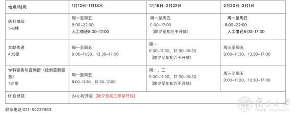 寒假期间,各馆具体开放时间请见附表所示。若在相关阅览室关闭期间需要使用其中书刊资料,请提前和值班老师联系,联系方式详见图书馆主页。同时,馆际互借服务暂停。若有特殊需求,读者可提出申请,经核准后作个别处理。