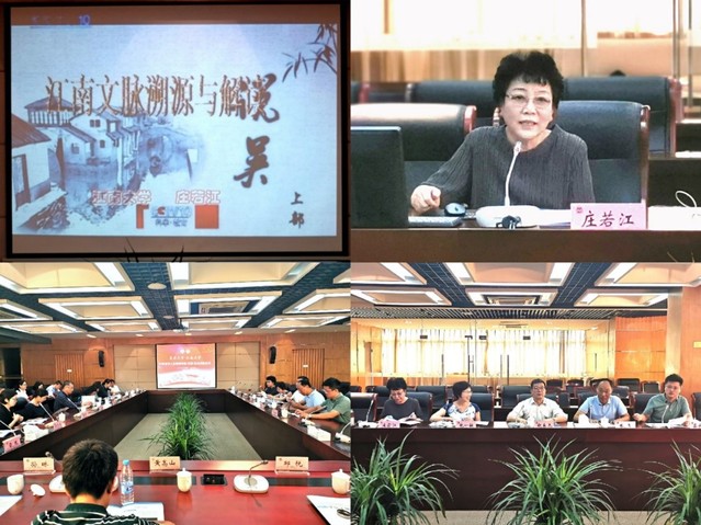 考察活动的第一项内容,是聆听吴文化研究专家、江南大学人文学院庄若江教授的文化品牌讲座——“江南文脉溯源与解读”。庄教授从3100多年前“泰伯奔吴”的故事讲起,回顾了吴国600多年的历史演变。她引经据典、娓娓道来,向大家呈现了曲折动人、悠远厚重的吴文化历史图鉴,同时结合实例,总结出江南文化的特点是尚德向善、灵动智慧、开放善纳、和谐共荣。“隋唐京杭大运河的开通,以及宋以后对漕运的依赖,加速了吴地与中原的互动,也推动了江南地区逐渐融入经济文化的中心地带。”