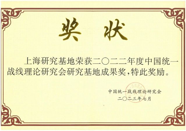 近日,中国统一战线理论研究会研究基地工作会议在兰州召开。中央统战部研究室领导及全国11家研究基地代表与会。经过评选,上海研究基地荣获2022年度中国统一战线理论研究会研究基地成果奖。
