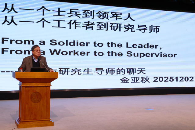 中国科学院院士、复旦大学特聘教授金亚秋以“聊天”的形式作了题为《从一个士兵到领军人,从一个工作者到研究导师》的报告,分享自身凝练多年的育人智慧。金院士强调,一名优秀的导师应兼具认真、诚实、激情、勇敢、专注、探索和自由的品格,既要引领学生“看中国、看世界、看古今中外”,更要教会学生“成功不在于聪明,而在于专注与坚韧”,其质朴深刻的感悟令在场的导师们深受启发。