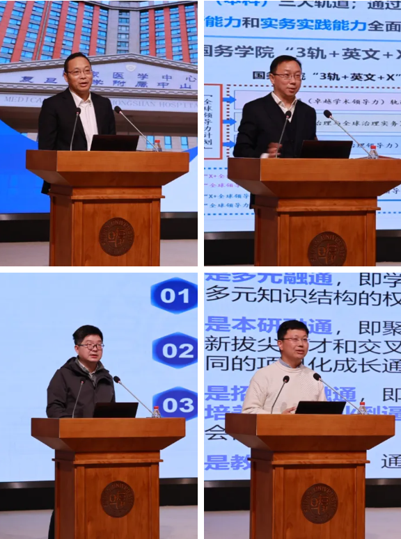 在院系交流环节,上海医学院中山临床医学院副院长孙益红、国际关系与公共事务学院副院长张骥、数学科学学院副院长张仑、计算与智能创新学院副院长彭鑫代表全校的研究生培养单位作交流发言,分享各自院系教育教学改革的方案和经验做法。