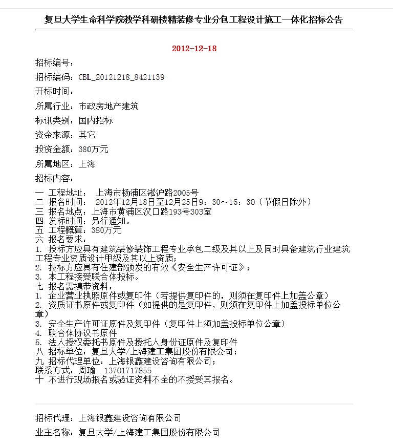 复旦大学生命科学院教学科研楼精装修专业分包工程设计施工一体化招标