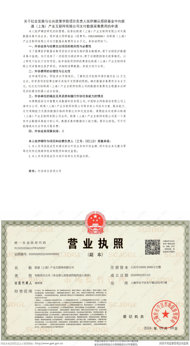 关于社会发展与公共政策学院项目负责人张伊娜从预研基金中向联通(上海)产业互联网有限公司支付数据采集费用的申请