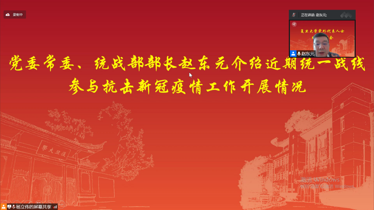 赵东元代表党委统战部、医学统战部向参与抗疫斗争的各党派、团体的同志表示了衷心感谢,并着重汇报了3月中旬以来学校统一战线抗击新冠疫情工作的基本情况。疫情爆发后,校党委统战部和医学统战部携手各民主党派、团体,在市委统战部、党派市委的支持下共克时艰,以不同形式坚守教学科研一线,投身校内外抗疫工作,积极建言献策,为抗击新冠疫情的胜利贡献了复旦统战的智慧和力量。校统战部门高度重视思想引领工作,积极引导党外人士服务中心大局;深入推进关爱帮扶工作,广泛团结党外人士凝聚人心汇聚力量;及时创新工作平台,提高统战宣传水平与服务效能。会上,赵东元还就2021年学校统战工作主要进展作了简要回顾。